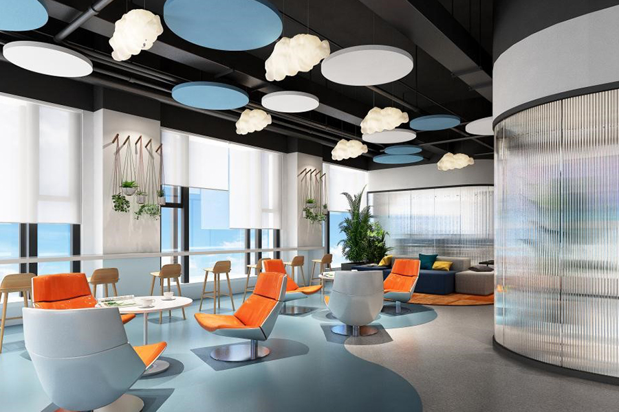 地面獨特的裝飾、裸露的天花構造和異性造型等豐富多元的場景設計允許員工自由選擇最佳的工作方式完成每日的工作,以其創新的設計連接起周邊的工作區,并吸引人們來此交流匯聚,成空間的核心紐帶。每天的早會由此開始,團隊協作會議也在此愉快地開展。會議室和安靜的則用于更正式的會議或專注的工作行為,大型社區和茶水吧臺區域則更有利于促進員工間的交流協作和即興互動。