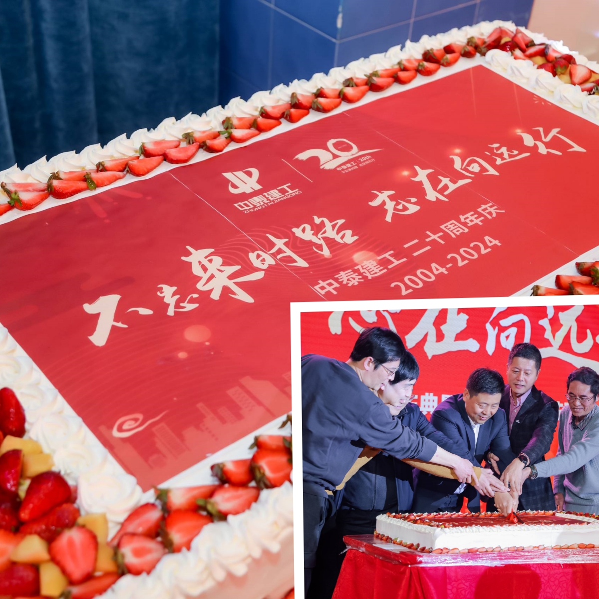 20周年慶典蛋糕。它不僅僅是一個蛋糕,更是中泰建工與各位合作伙伴深厚情誼的象征,是我們共同孕育的果實,甜蜜而珍貴,見證了中泰建工20年的風雨兼程,更承載了每一位員工辛勤付出的汗水與努力。